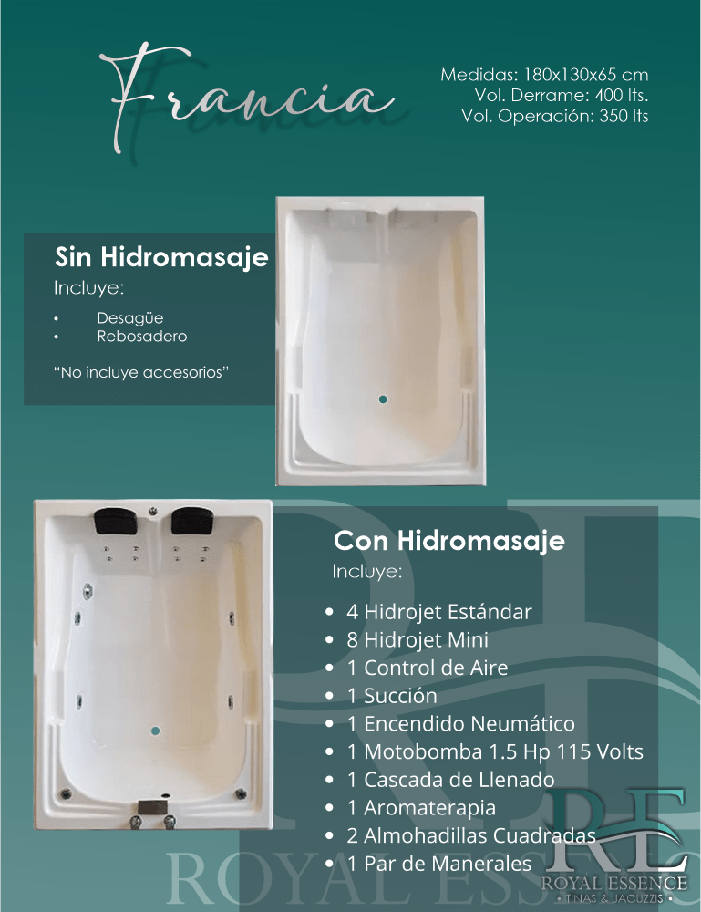 Modelo Francia con Hidromasaje – 180x130x65cm