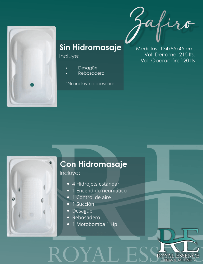 Modelo Zafiro con Hidromasaje – 134x85x45cm